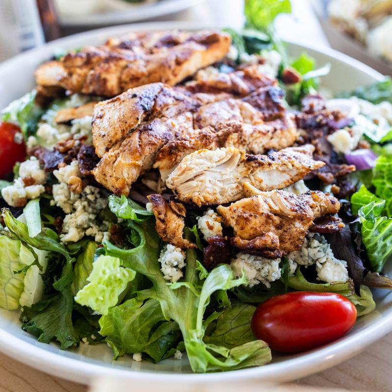 Blackened grilled chicken, bacon crumbles, lettuce, tomato, cucumber, red onion, crumbled blue cheese, sliced avocado & a sliced egg.